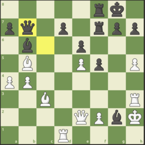 Danach gab es erst mal 2 Stunden keine Ergebnisse, bis an meinem Brett folgendes passierte, was uns nicht gefallen konnte: Wegen des Übersehens eines simplen Doppelangriffs auf meinen a- und g-Bauern hatte ich lieber den g-Bauern gegeben mit gewissen Hoffnungen auf "offene g-Linie und Bauernmajorität am Damenflügel". Folgerichtig Tg3 (??) in der abgebildeten Stellung, welches durch einen schönen taktischen Schlag sofort verliert (Auflösung unten).