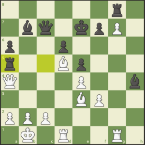 Dass war dann um die +4 Stellungsbewertung und wickelte sich trotz reichlich Material und offener Stellung ohne dramatischen Kipppunkt zu einem Gewinn für mich ab. Daher hier eine Stellung aus einer (nicht allzu tiefen) Nebenvariante, in der es für Weiß einen originellen taktischen Schlag gibt:
